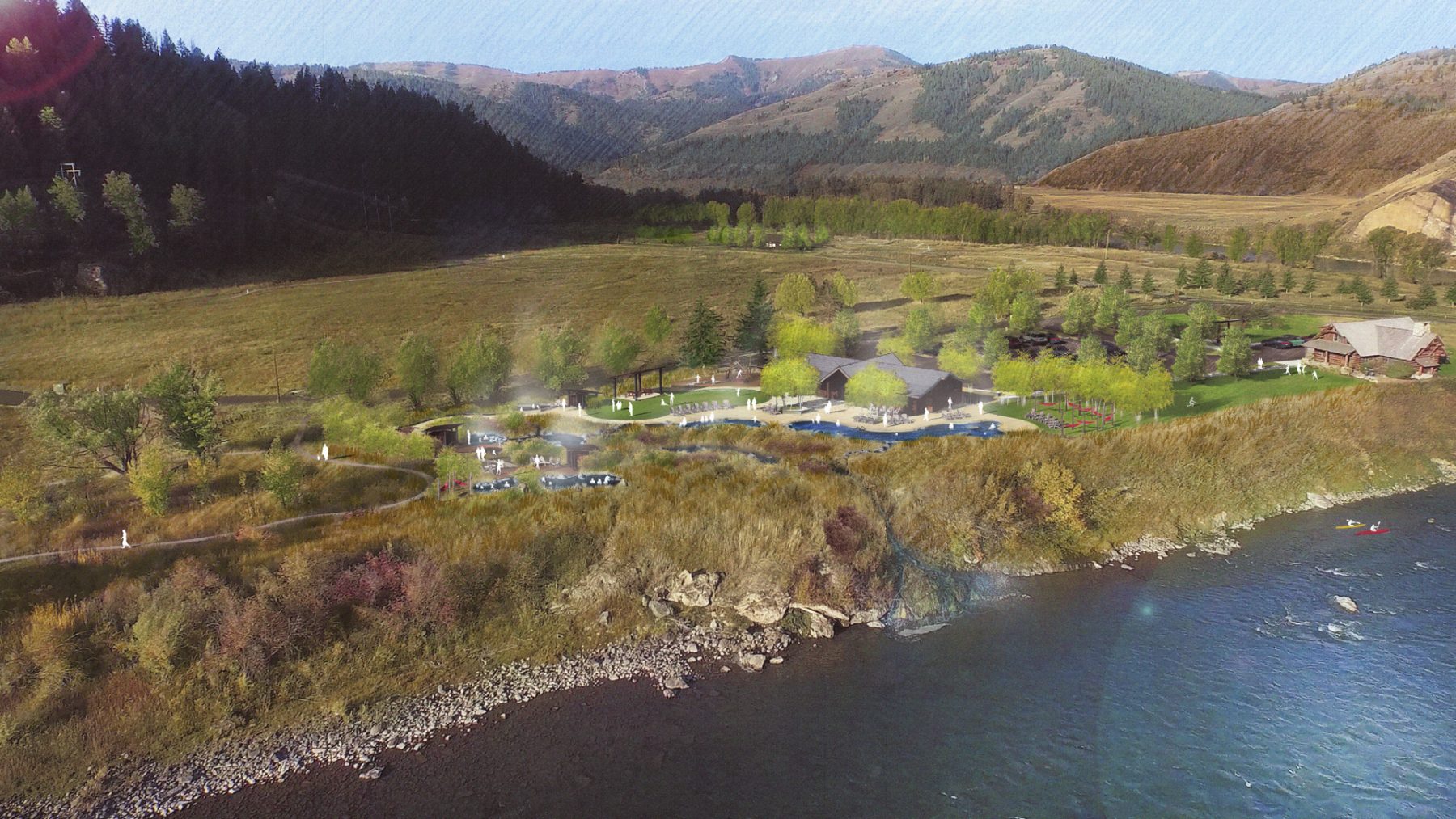Until it was closed to the public in 1999, Astoria Hot Springs was a scenic, familyoriented RV and tent campground with mineral hot spring pools, located on the banks of the Snake River about 15 minutes south of Jackson Hole, Wyoming. Astoria Hot Springs offered great swimming and camping for locals and summer visitors touring nearby Grand Teton and Yellowstone national parks. Developed in the early 1960s, the complex, including a large outdoor pool for children and adults and an adjacent triangular “kiddie pool”, was for many years the only local resource for children to learn to swim and for families to enjoy pool time together.