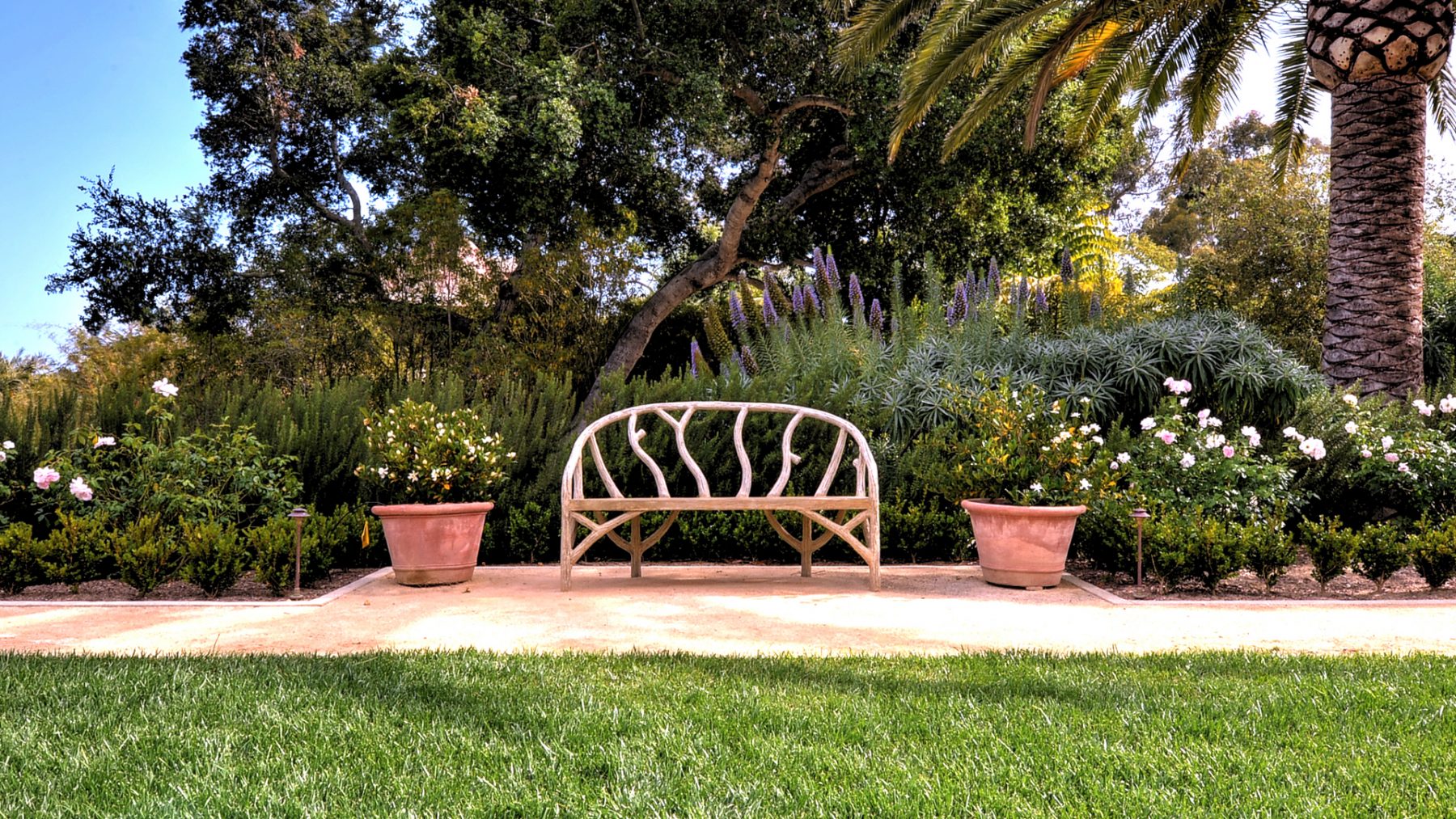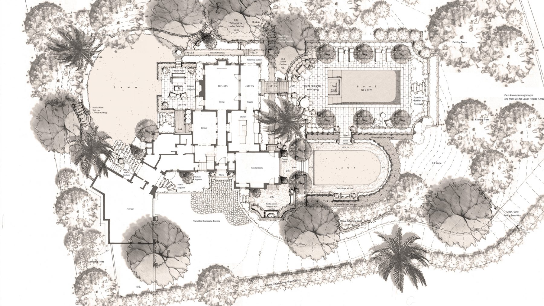 Marc Diemer (DHM Associate Principal), worked with renowned architect Kevin A. Clark on this secluded residential retreat just down the road from San Ysidero Ranch. The property achieves a quality of casual Mediterranean elegance, with gardens, swimming pool and gathering areas all carefully detailed to compliment the architecture. An emphasis was placed on the use of native plants, to blend the property into the surrounding hillsides and in response to the California drought.