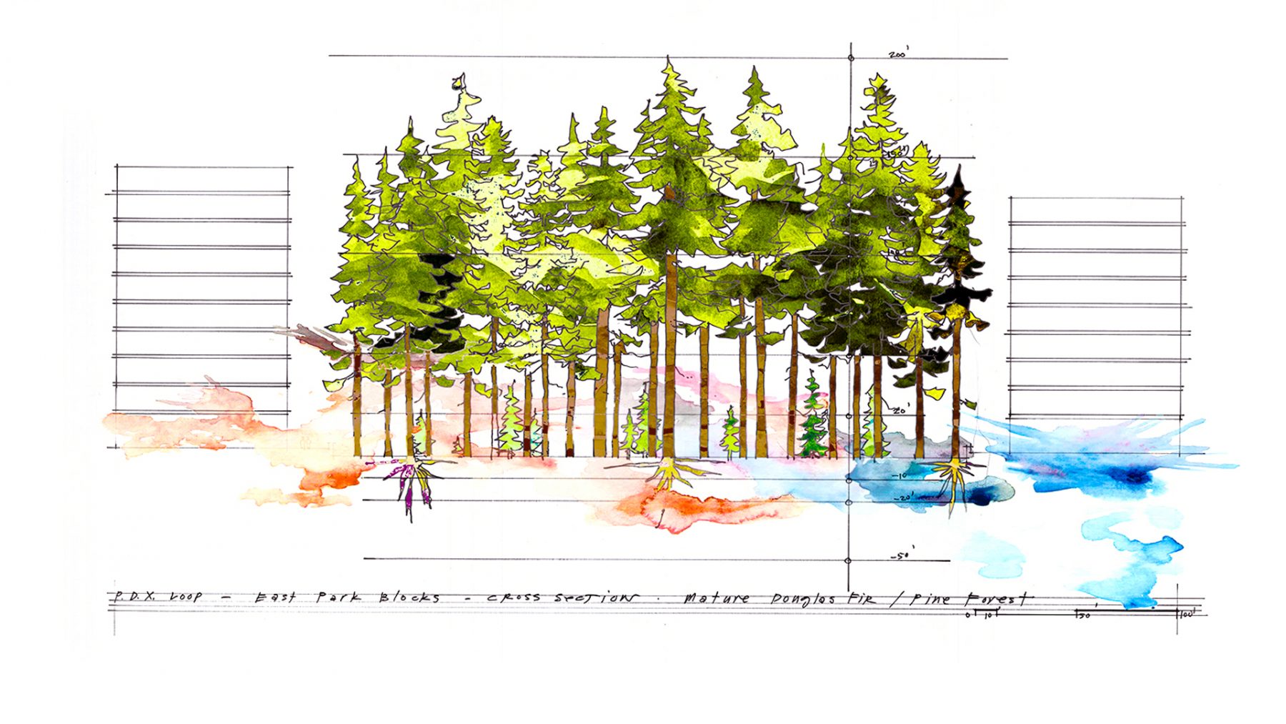 We partnered with Portland artist Tad Savinar, Ch2m Hill, and Hennebery Eddy Architects to compete in this international design competition for the Loop PDX in Portland, Oregon. The Loop PDX, a 6-mile pedestrian/bike greenway loop through downtown Portland, is intended to connect the Pearl District/Old Town, West End, Cultural District, PSU, South Auditorium, South Waterfront, OMSI, Central Eastside and Lloyd District with a single parkway that would cross the Willamette River at the Broadway Bridge and the Tillicum Crossing. We saw this as an incredible opportunity to not only connect these various districts, but to revitalize and enliven them, to blend circulation and recreation, and to allow a new vision of the “Sustainable City” to come to life.